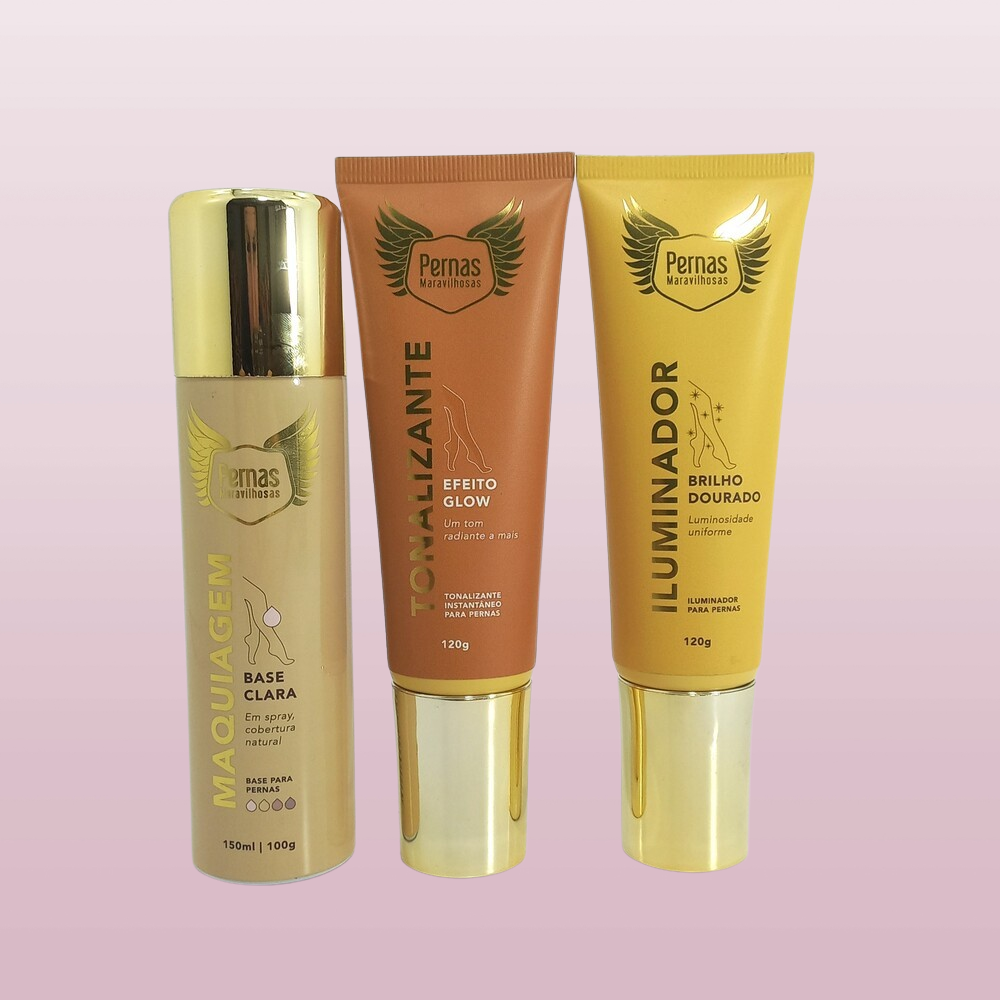 O kit pernas maravilhosas 3 em 1 foi desenvolvido para deixar suas pernas uniformes, iluminadas e com efeito glow instantâneo. Ideal para disfarçar imperfeições e valorizar a pele com acabamento natural e sofisticado.