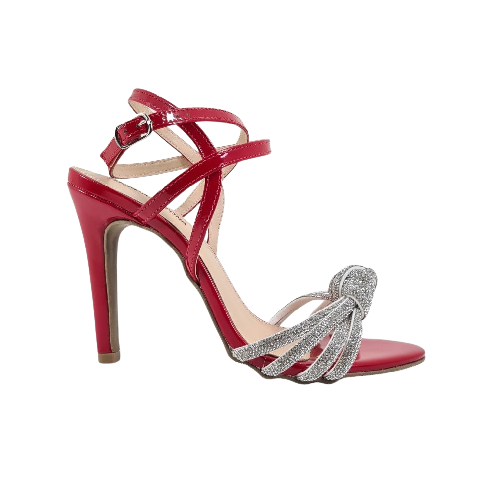 Sandalia feminina salto alto stiletto com 12cm de altura, bico redondo, possui as tiras que formam o nó na frente todas revestidas de cristais, o material é todo de metalizado, o fechamento é por fivela na lateral do pé.