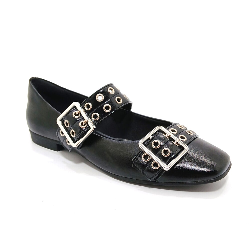 Sapato feminino em material sintético preto de alta qualidade, com acabamento elegante e moderno. Possui duas fivelas, uma ajustável, em metal prateado com ilhós decorativos, garantindo charme e melhor ajuste aos pés. Modelo fechado na frente e atrás, ideal para quem busca corforto sem abrir mão do estilo. Possui palmilha conforto, toda forrada por dentro com um material macio, possui elastico na fivela de ajuste para um maior comforto, solado resistente e confortável, perfeito para uso no dia a dia ou para compor looks urbanos e estilosos.