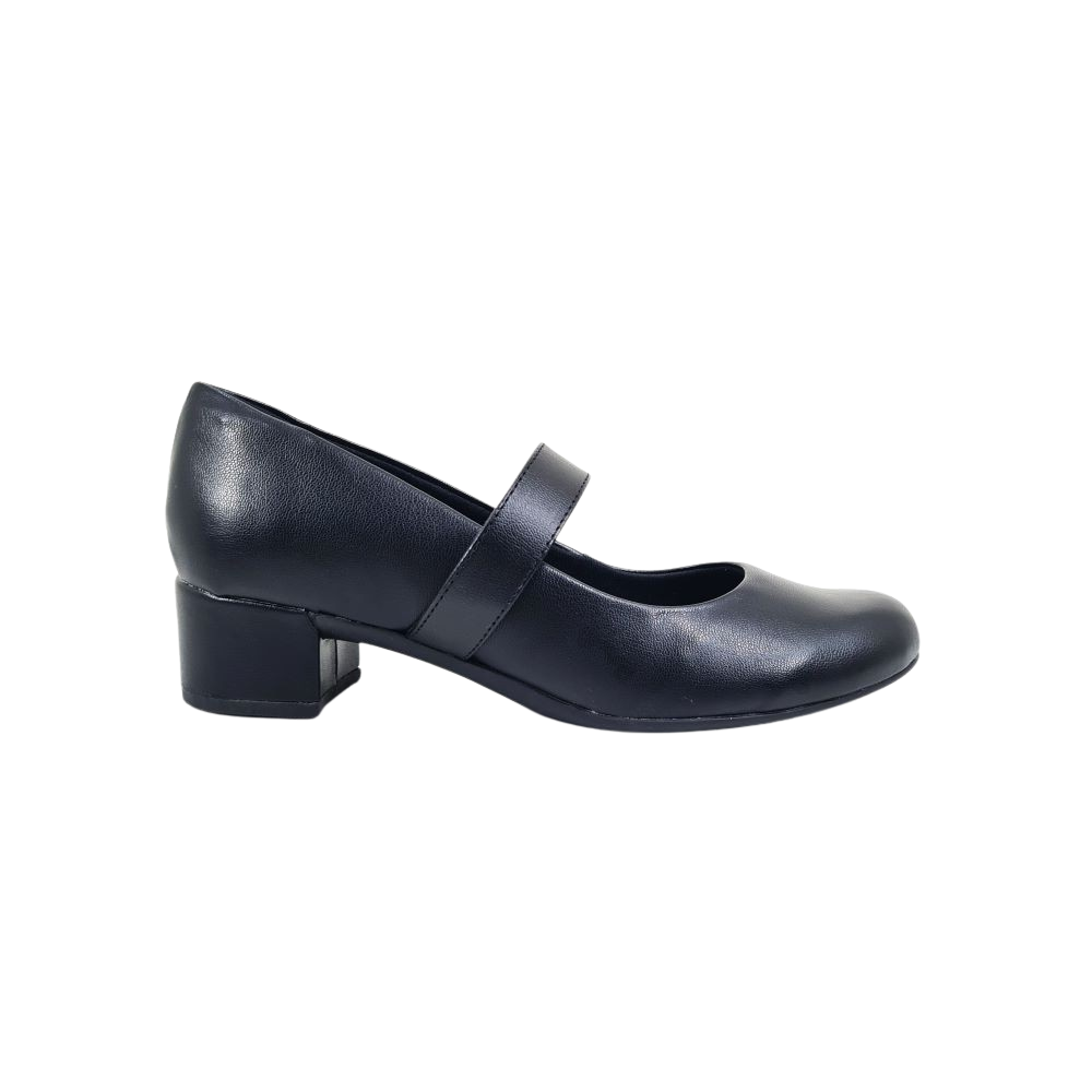 Sapato feminino com salto baixo, tem apenas 4cm de altura, possui bico redondo, tira que passa em cima do pé é de elástico que auxiliam muito para quem tem os pés larguinhos ou gordinhos, esse modelo tem um calce fácil.