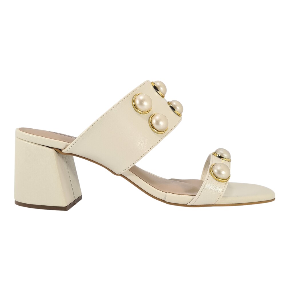 Tamanco feminino disponivel nas cores Off White e Preto, salto com aproximadamente 6cm de altura, possui duas tiras, uma mais fina que pega logo acima dos dedos e uma mais larga que pega no peito do pé, ambas as tiras possuem enfeites modernos que consistem em meias pérolas circuladas por um anel dourado, modelo muito lindo e bem confortável pois possui palmilha com espuma interna.