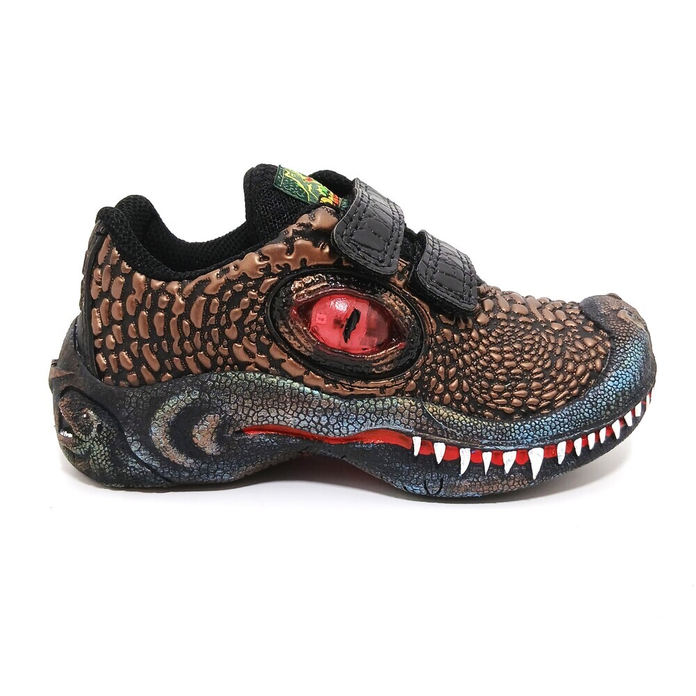 Tênis infantil estilo dinossauro super divertido e cheio de personalidade! Com design 3D realista e textura que imita a pele do dino, ele chama atenção pelo incrível olho lateral com luz de LED, que acende e deixa o visual ainda mais radical.